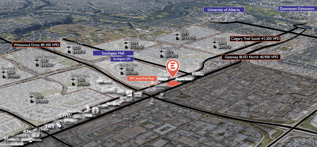 The location is on one of Edmonton’s highest-profile corridors, seeing over 82,000 VPD past the site (2018). Within 300 meters, Whitemud drive sees commuter traffic of 89,100 VPD. The retail corridor is home to well-established and nationally recognized brands; RE/MAX Excellence Commercial Division among those with building signage within a few short years.