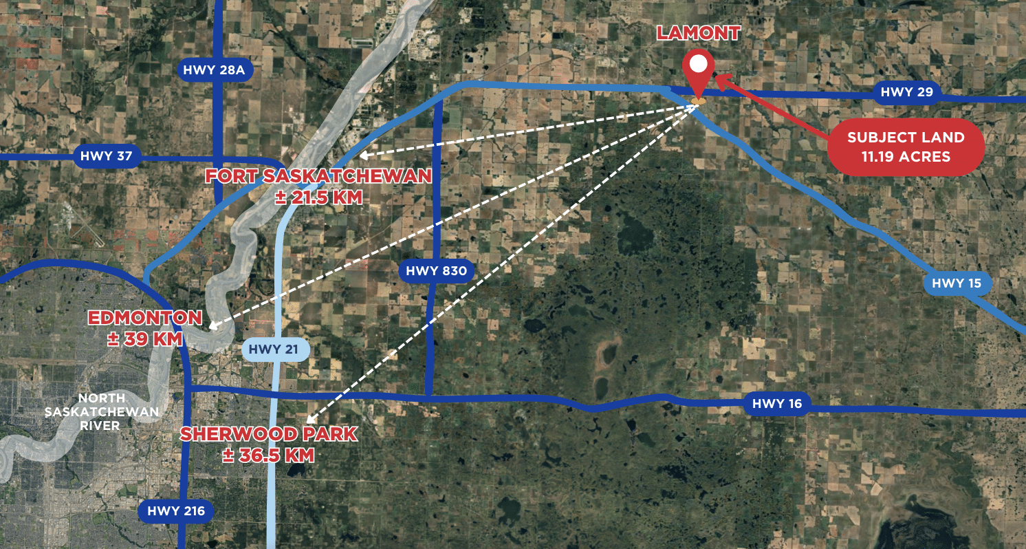This 11.19-acre development opportunity is located within the town of Lamont, just a short 40-minute drive east of Edmonton along Highway 15.