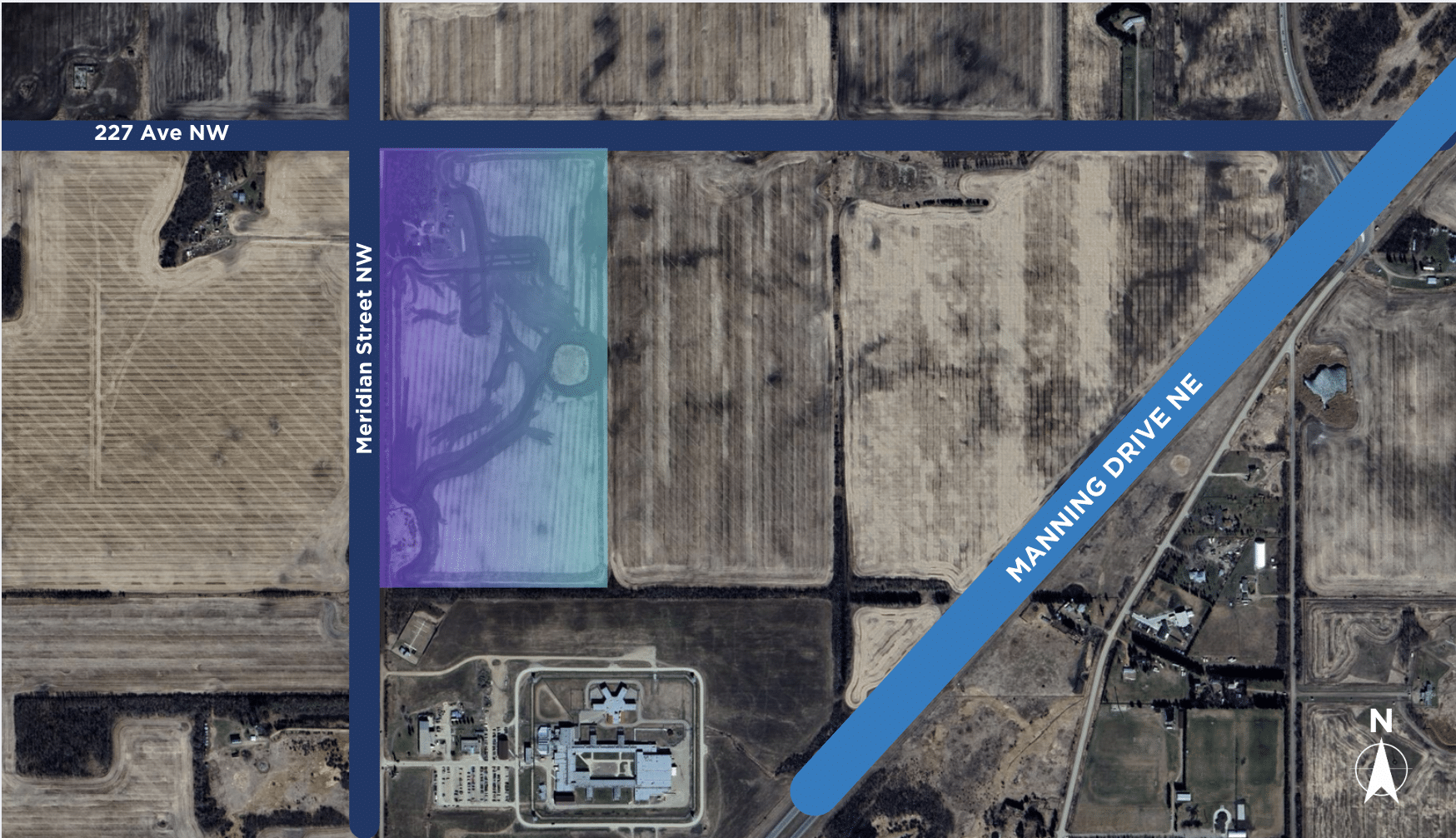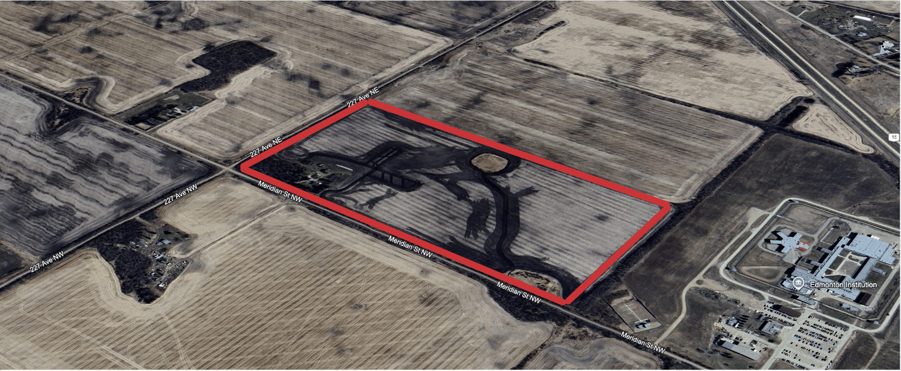 This 80-acre agricultural land, located within the Edmonton city limits, is situated along Meridian Street and 227 Avenue, providing easy access to Manning Drive, a key transportation route.