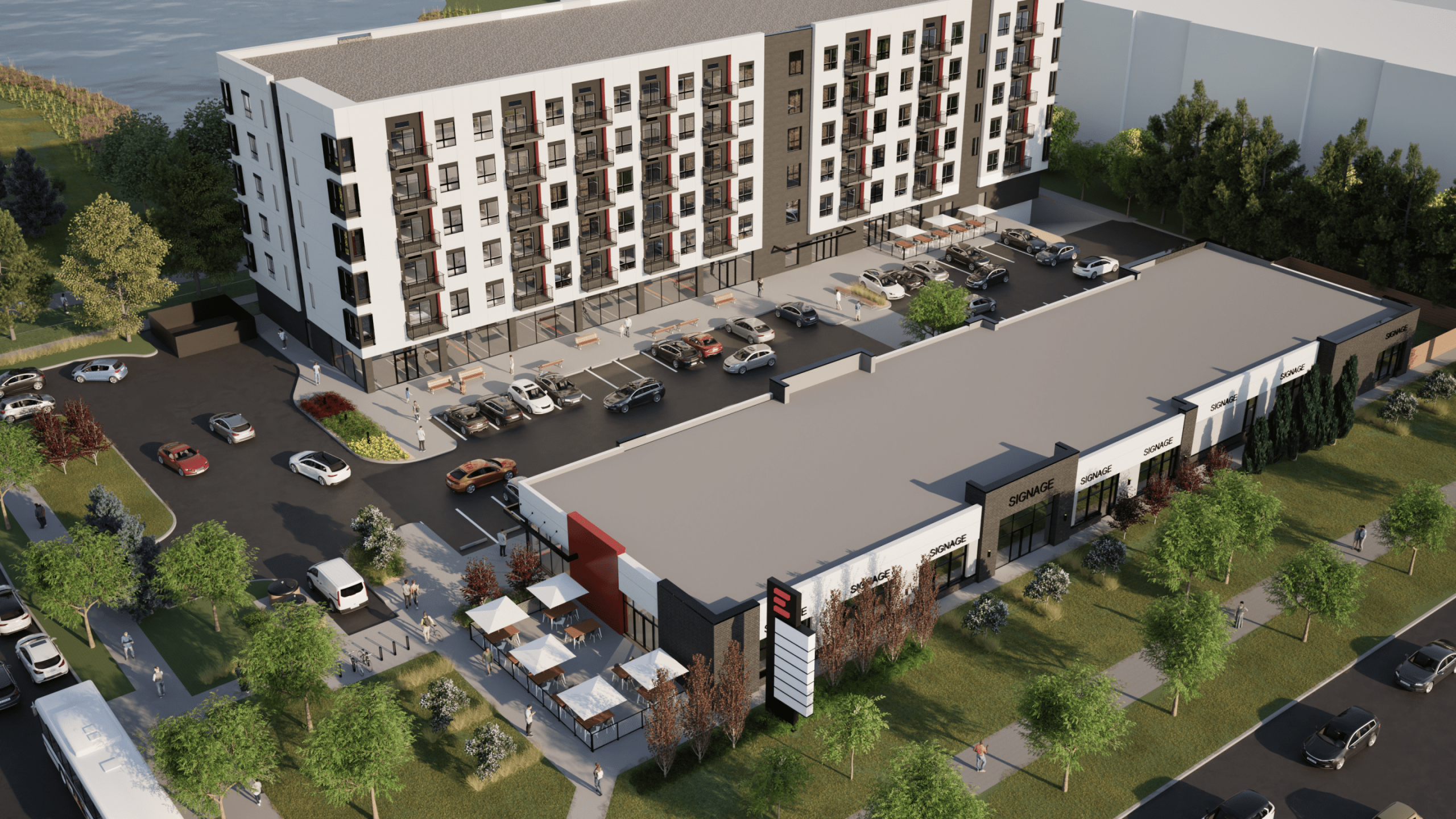 The site offers desirable frontage and exceptional exposure for CRUs, and backs onto green space and a pond with pedestrian walking trails. Future tenants include a medical clinic and pharmacy, dental clinic, nail salon, Vietnamese restaurant, and daycare, and will be well supported by the six-storey apartment building on the site.