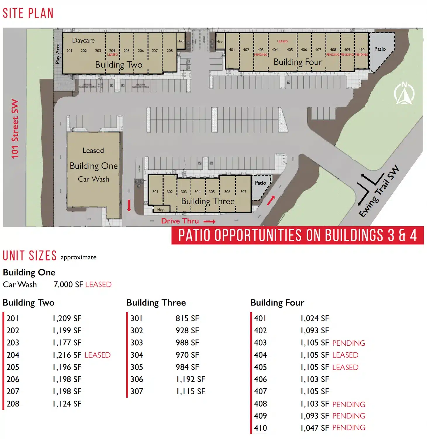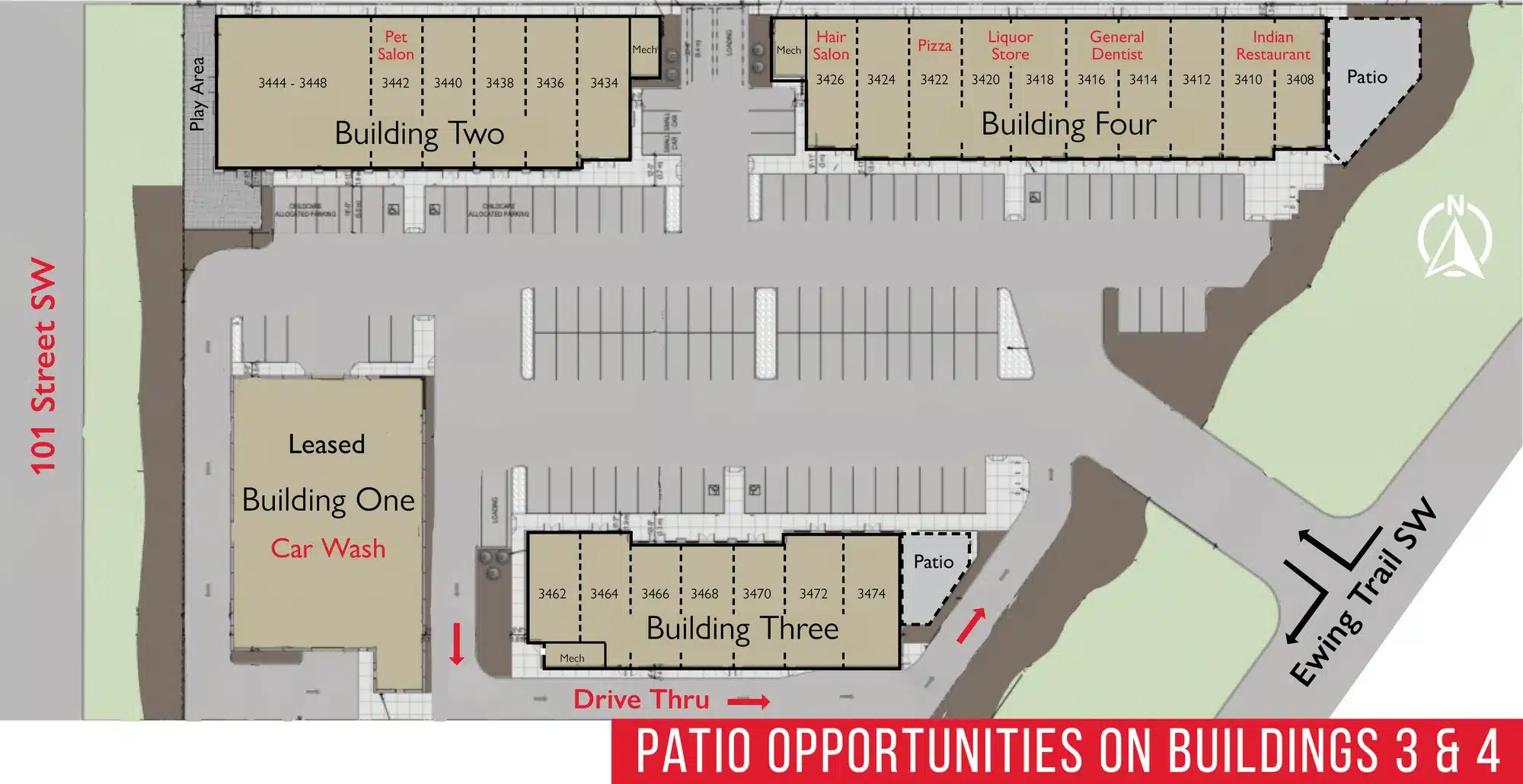 The area is rapidly developing with the Amazon Fulfillment Centre and Edmonton Soccer Dome as the latest additions. The plaza is located close to the Ewing Trail and 41 Avenue SW intersection; these arterial roads are seeing upgrades/widening to accommodate for the increasing traffic flow. The development is near the diverse, young, and high-income neighbourhoods of Orchards, Summerside, Ellerslie, and Rutherford.